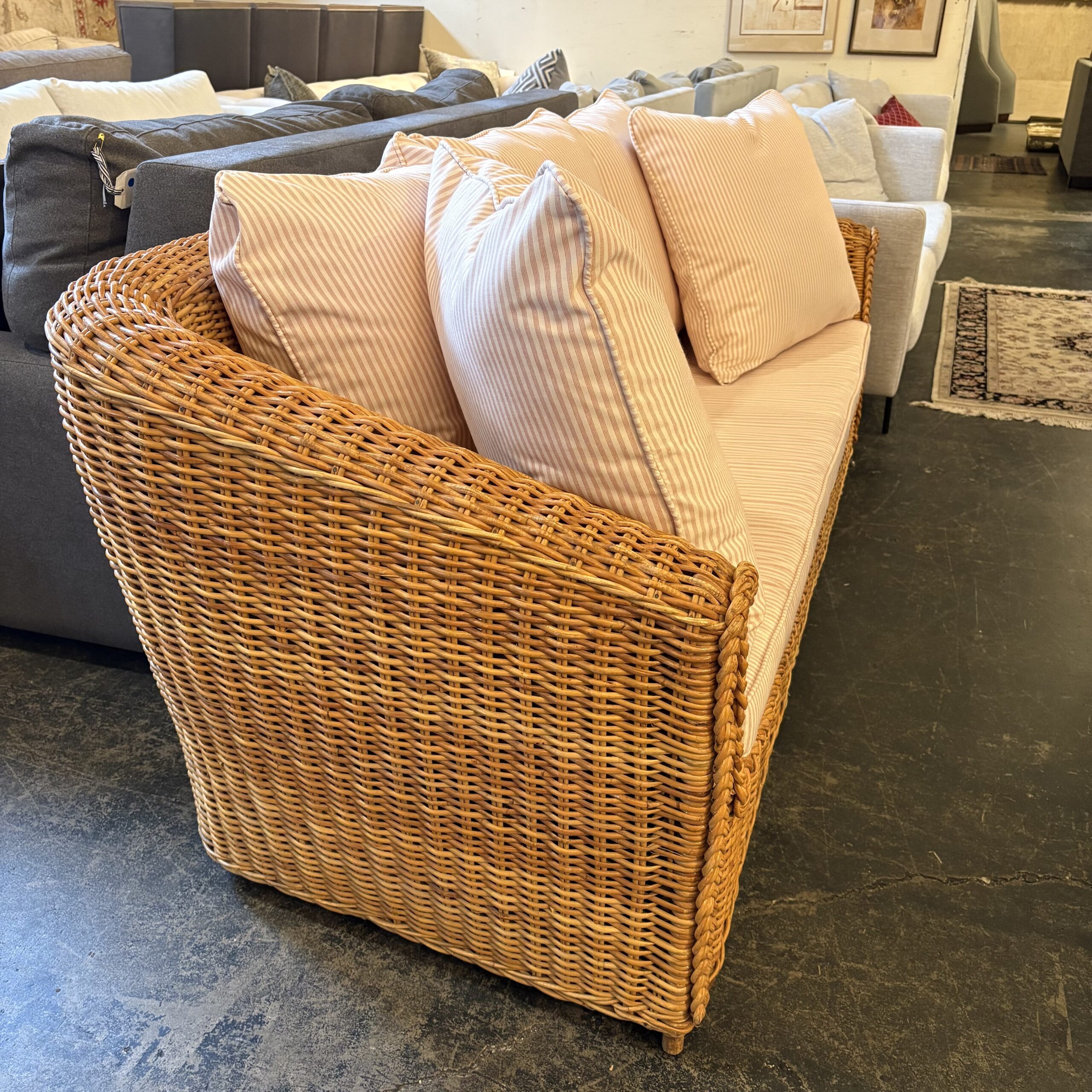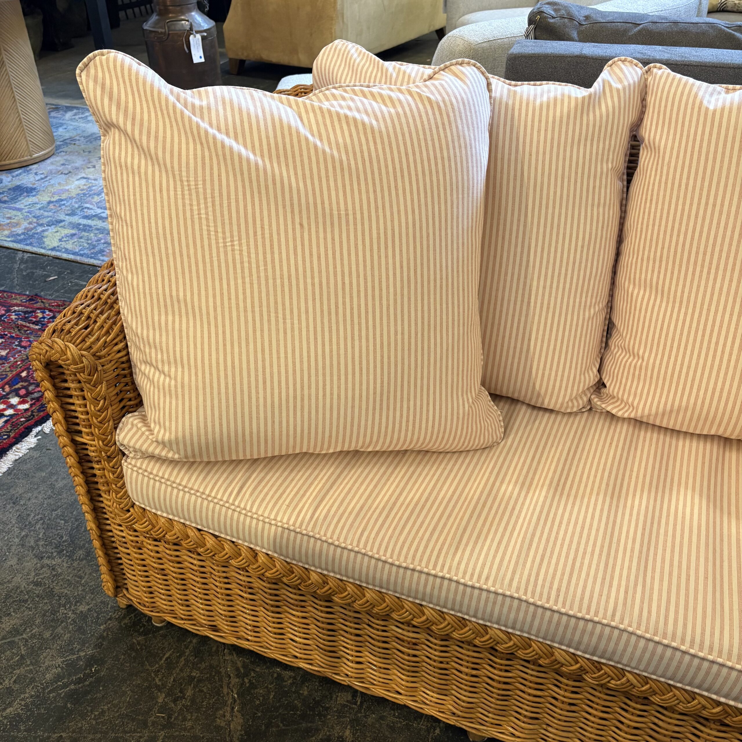 - Wicker sofa frame with candy striped outdoor cushions
