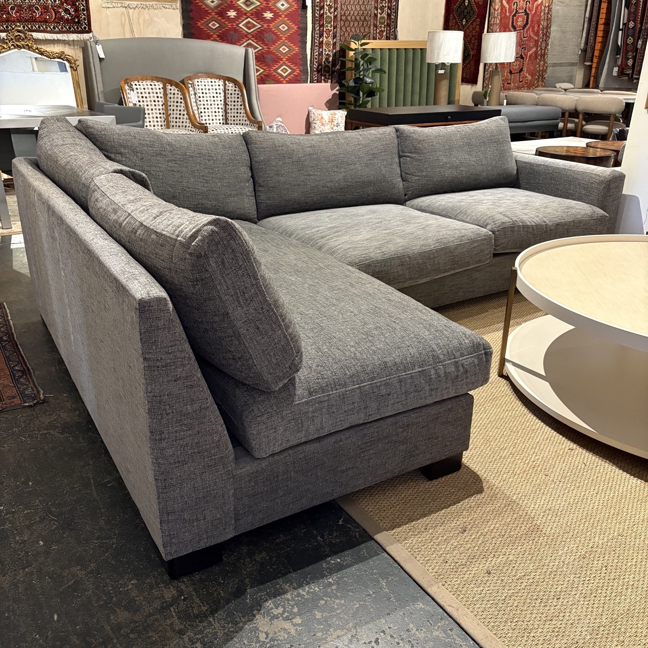 - Dark grey upholstery with 'Uptown Dark' stained wooden legs