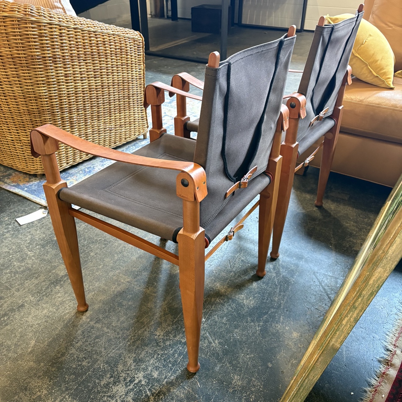- Brown canvas seat and back with brown leather arms and wooden frame