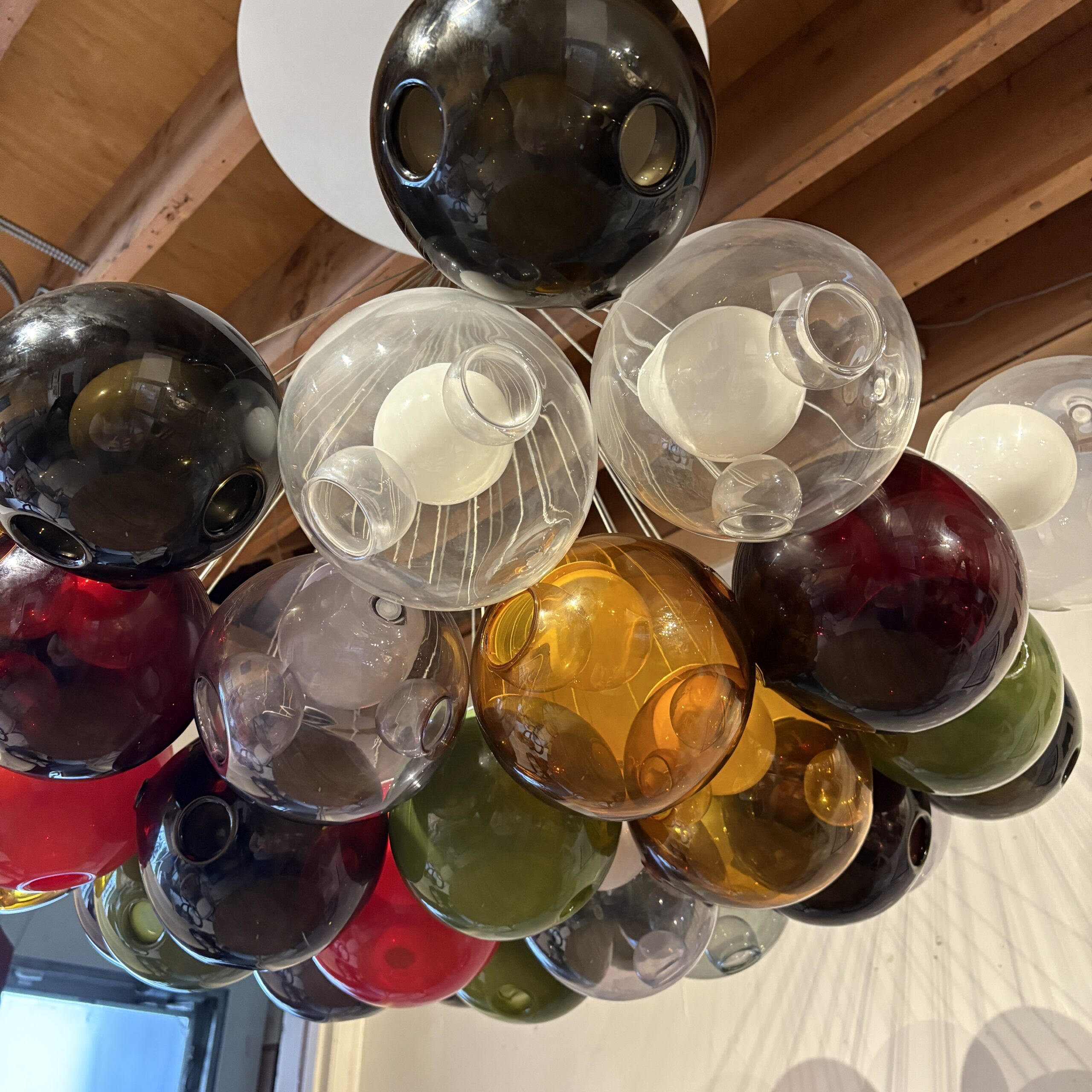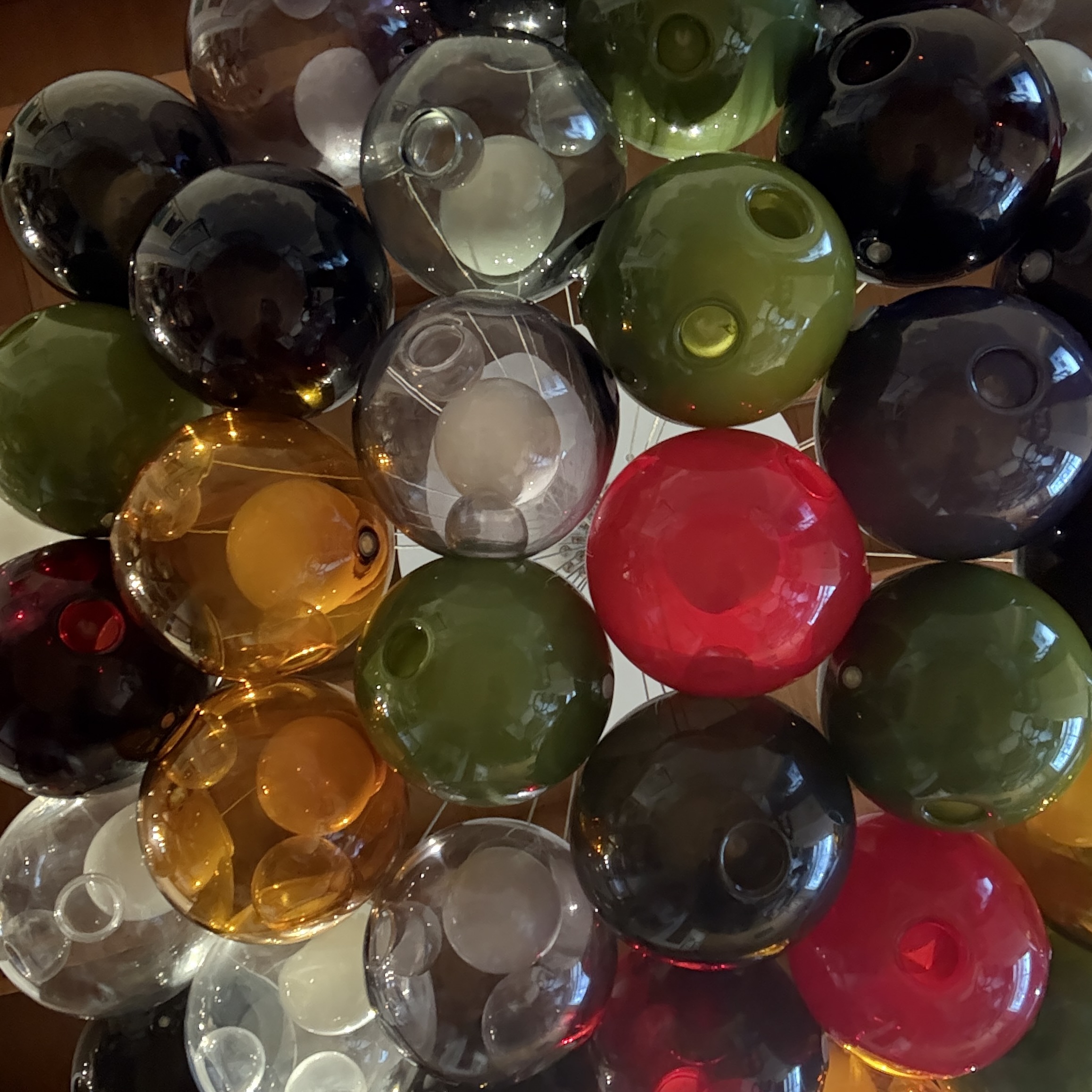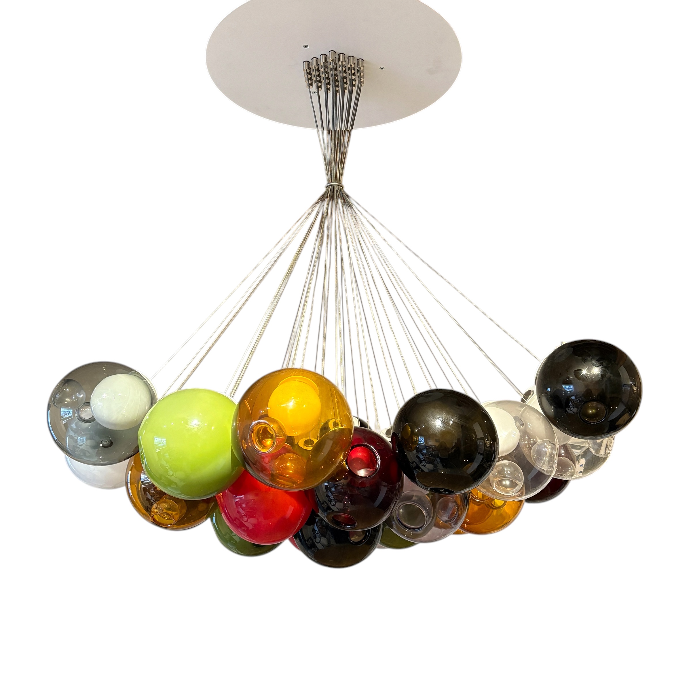 - Composed of 37 hand-blown glass pendant of varying colours that attach using a connector to a single cluster canopy