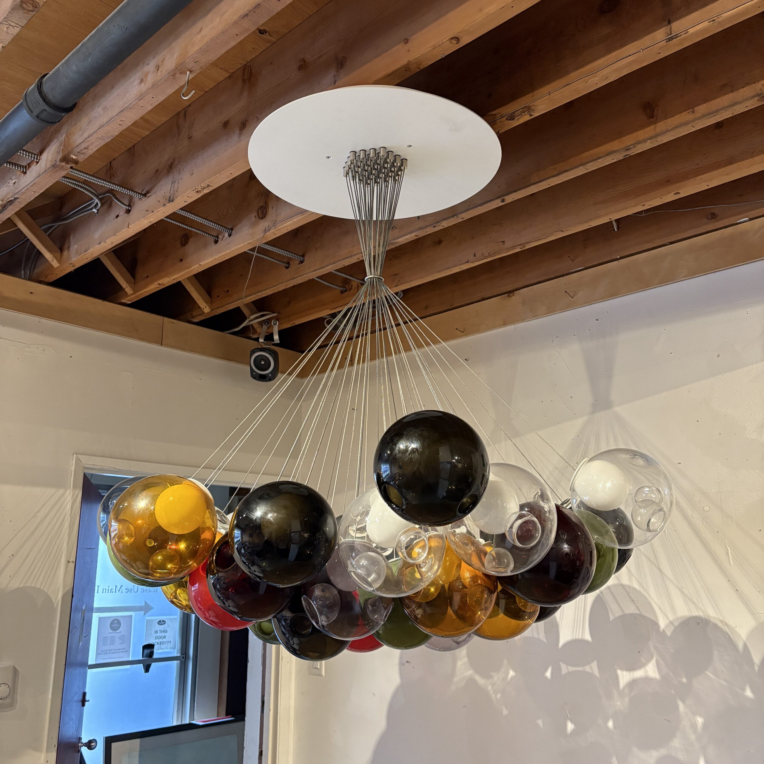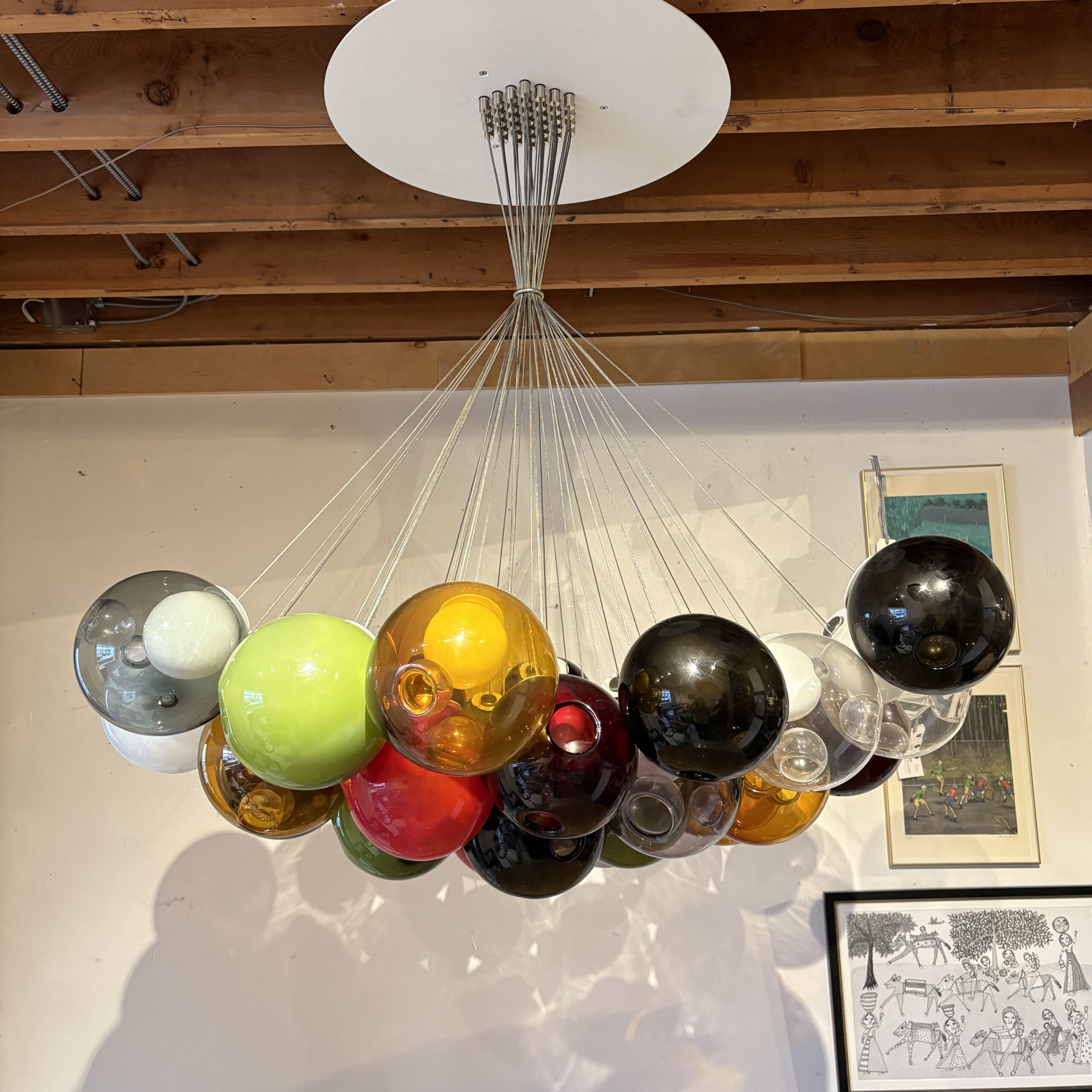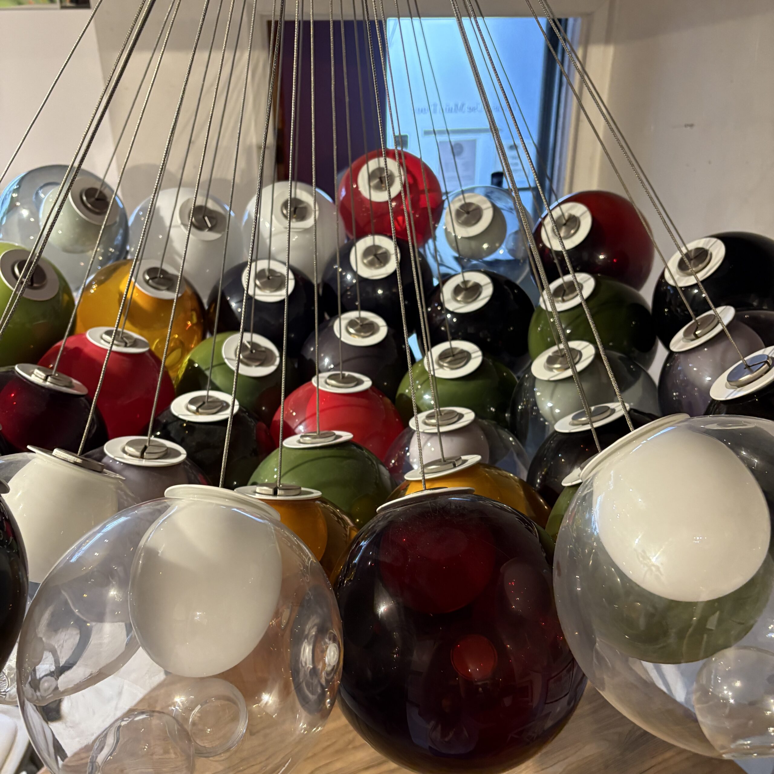 - Composed of 37 hand-blown glass pendant of varying colours that attach using a connector to a single cluster canopy