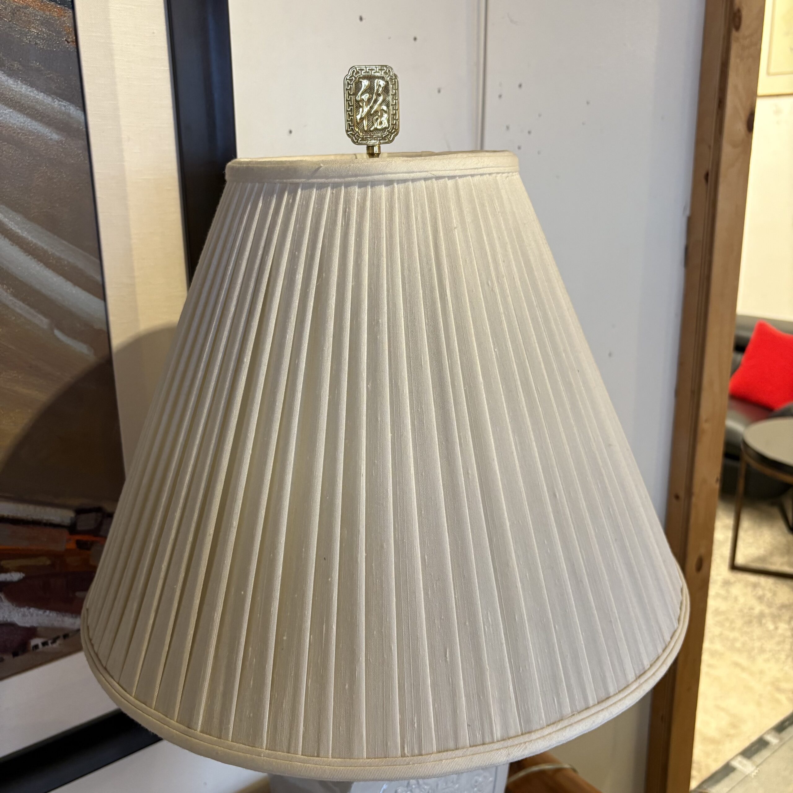 - White ceramic table lamp with wooden base, white shade, and brass finial