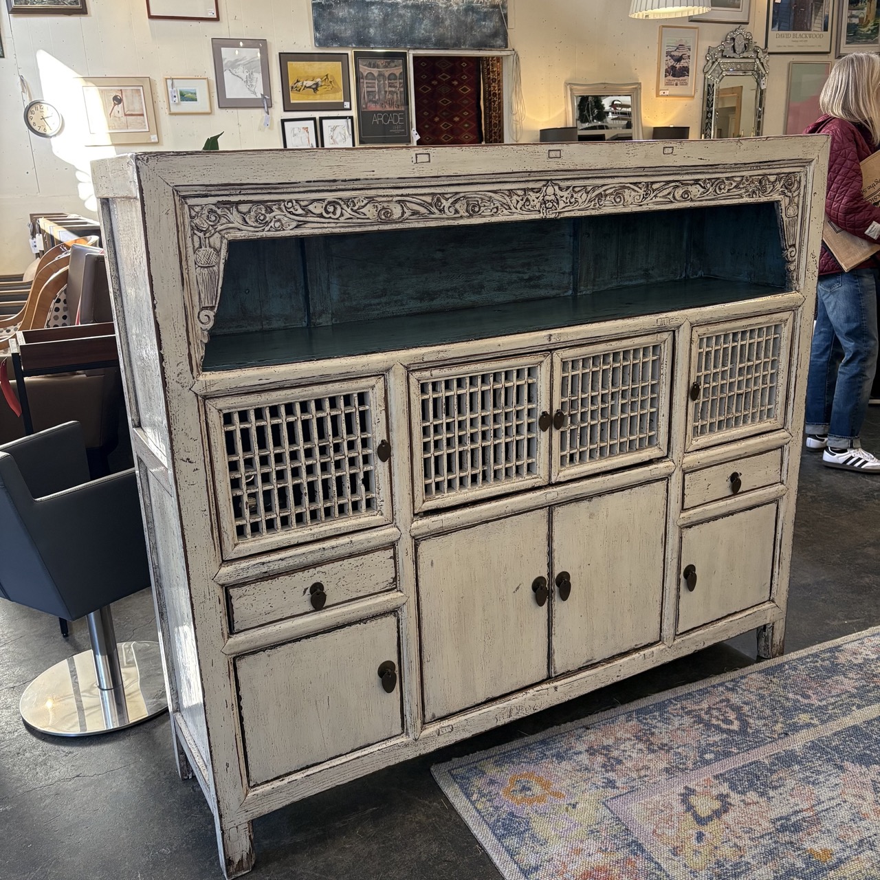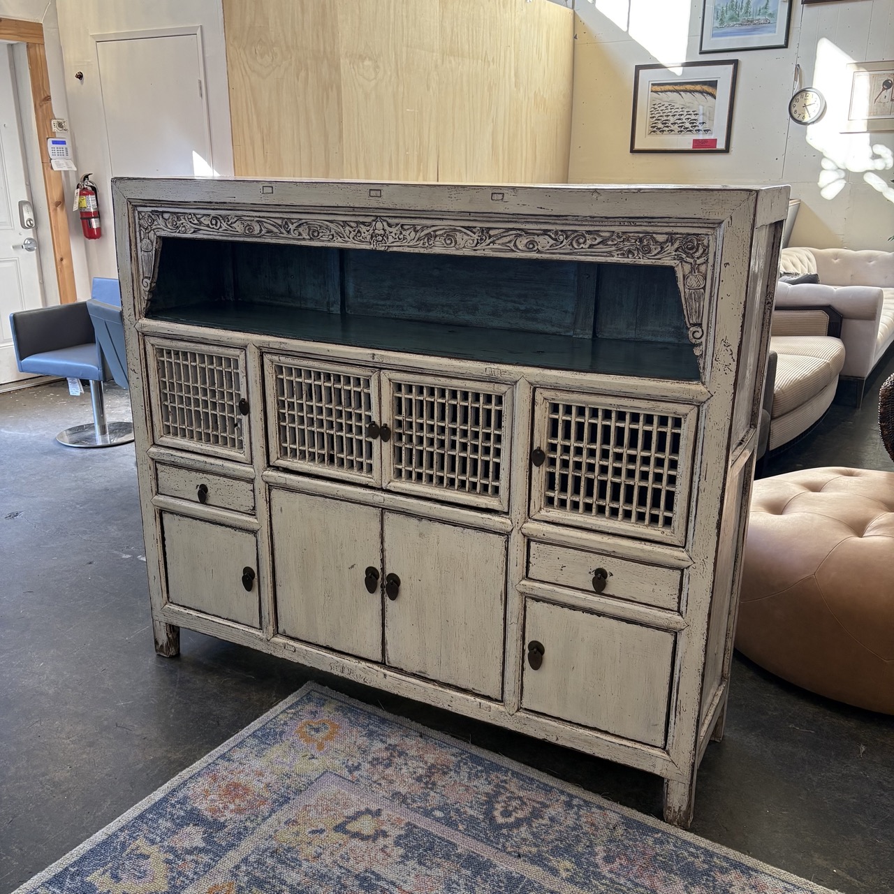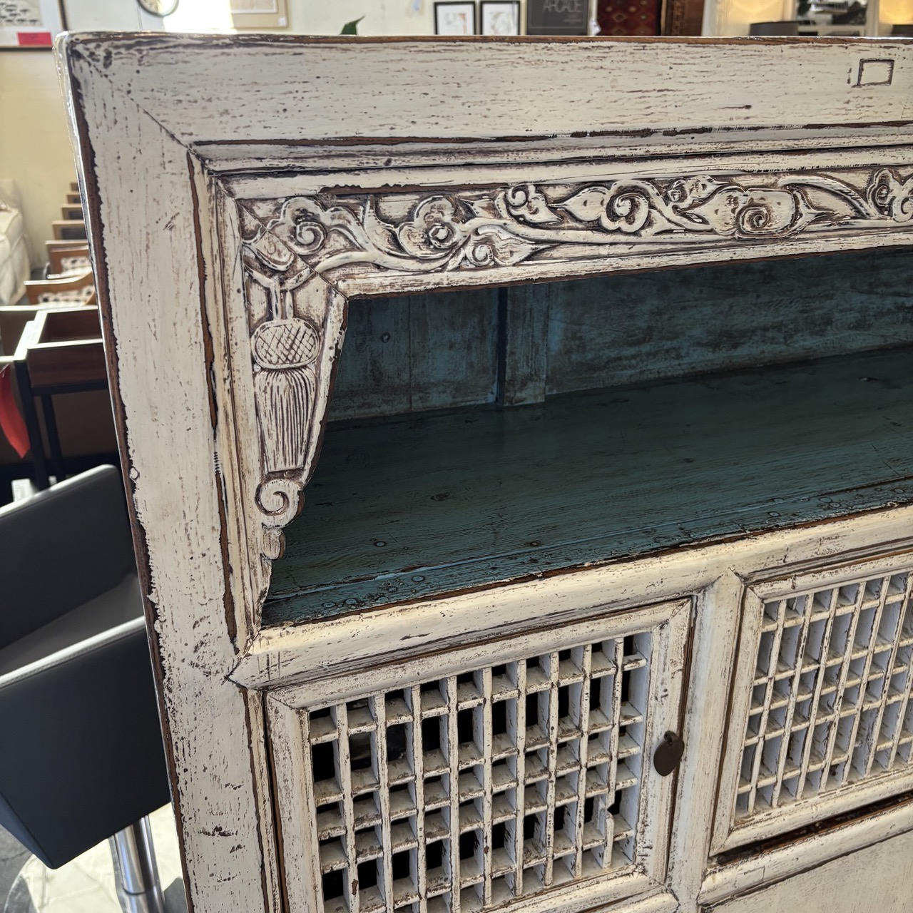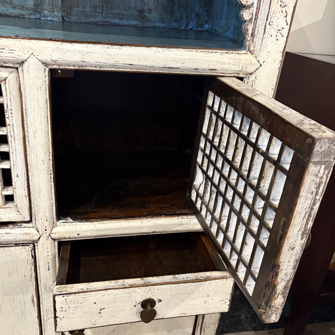 - Wooden sideboard painted white with blue painted open shelf