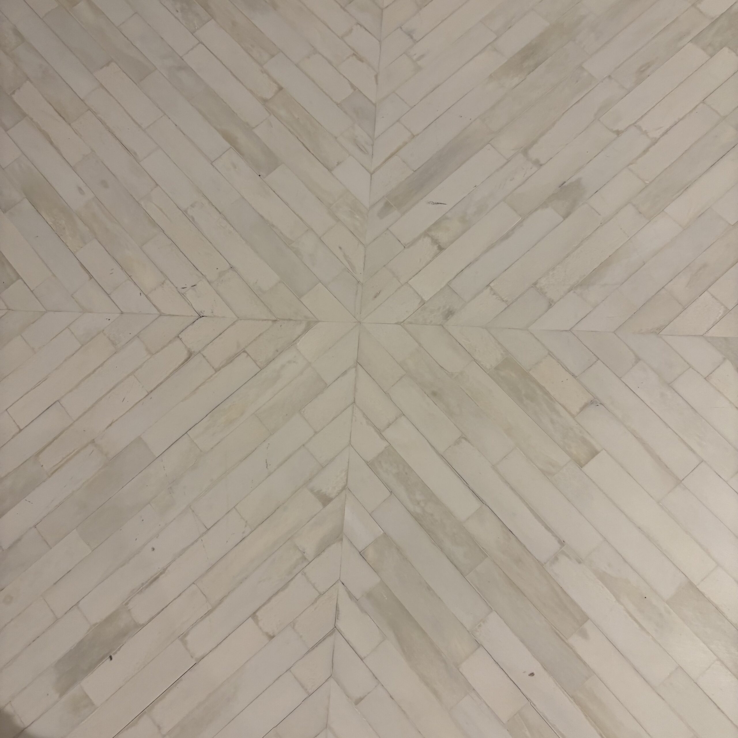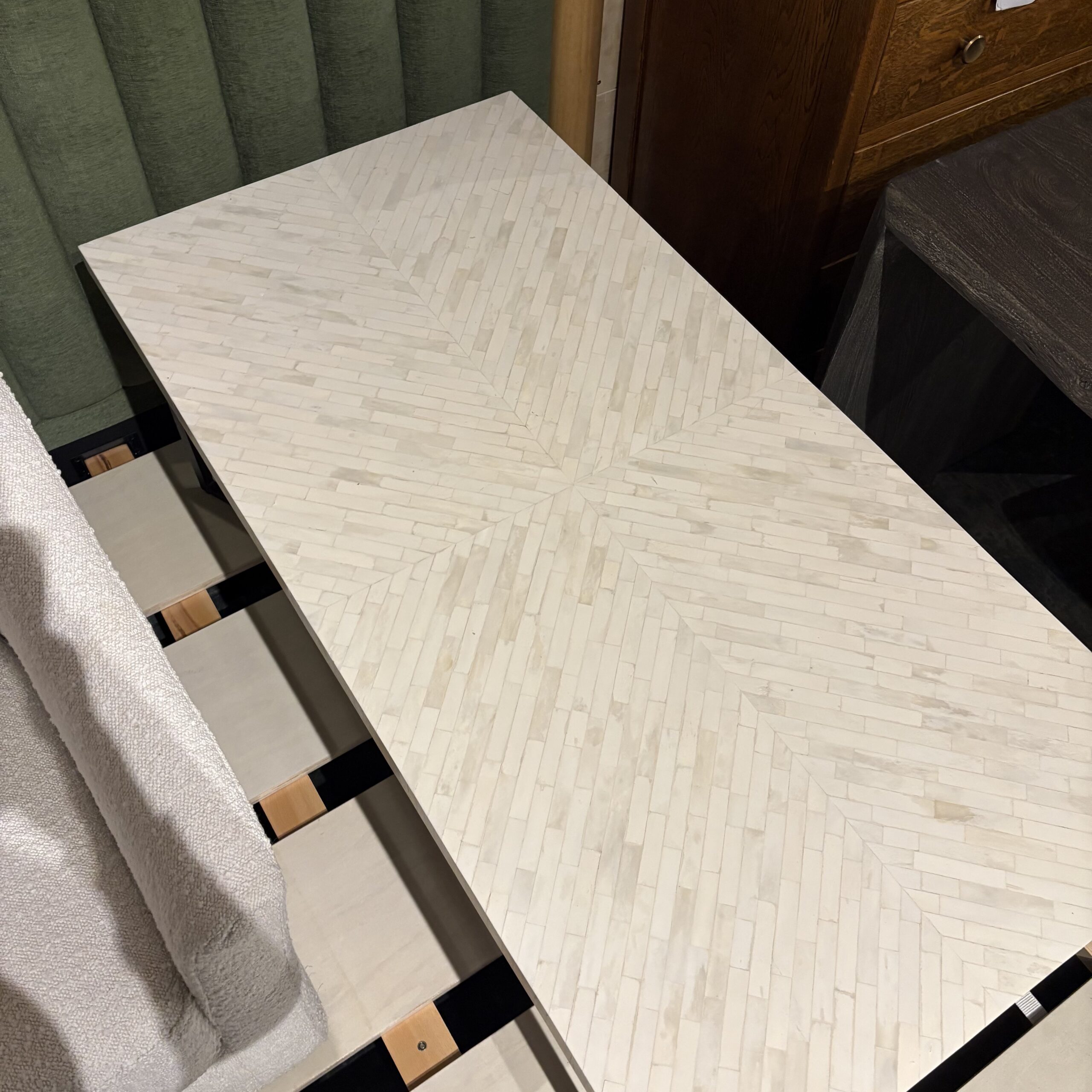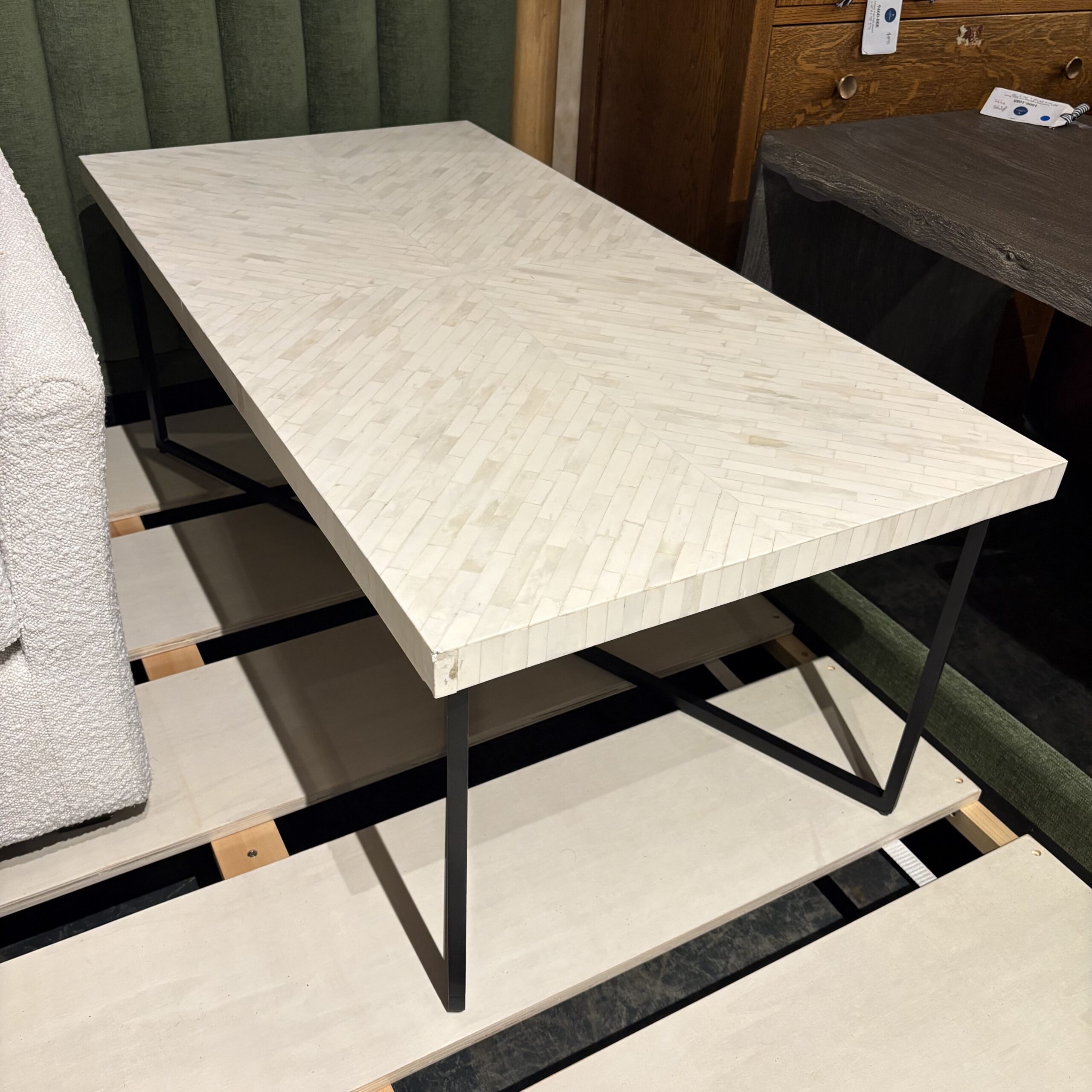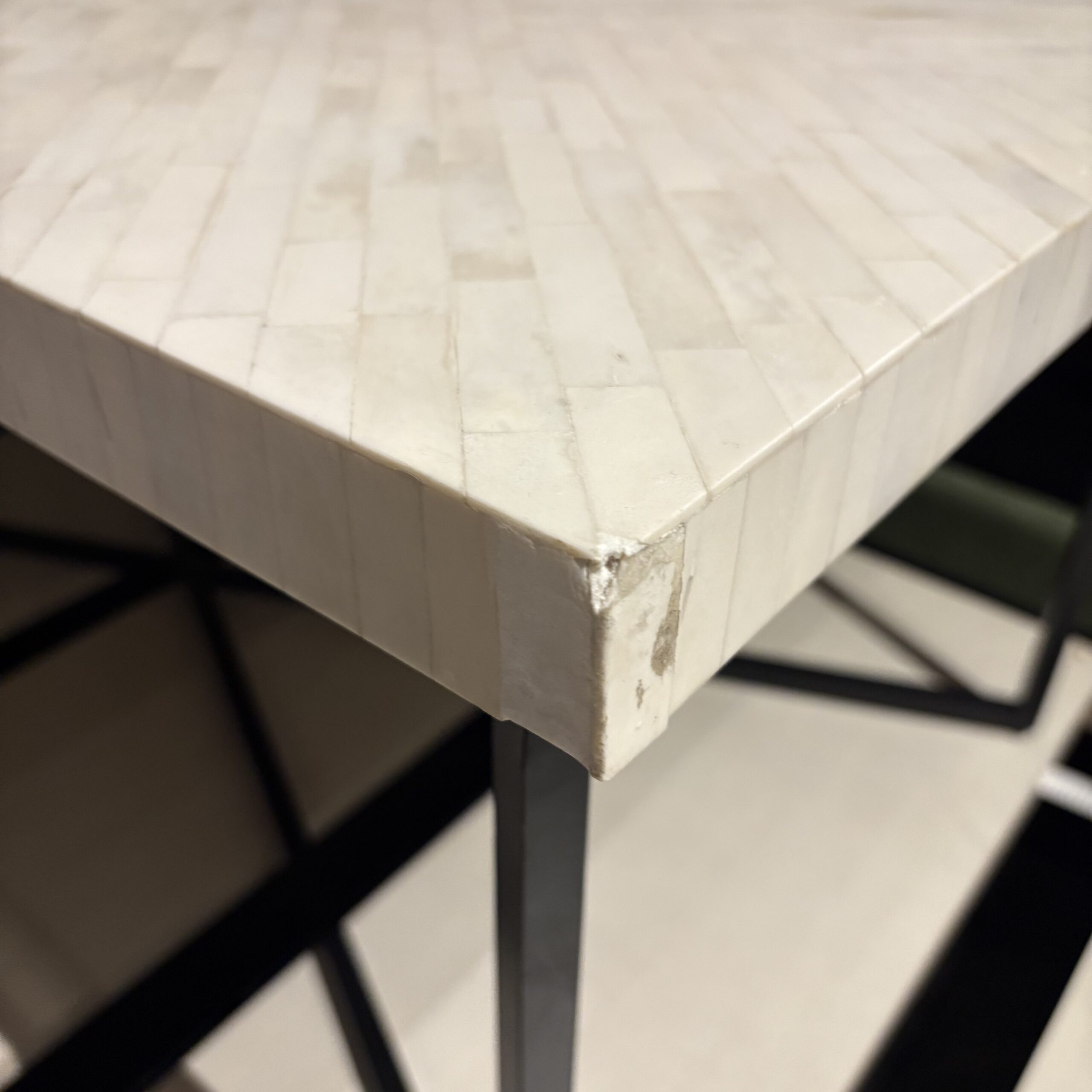 - Rectangular white stone tiled top in herringbone pattern, black metal base, and a durable construction