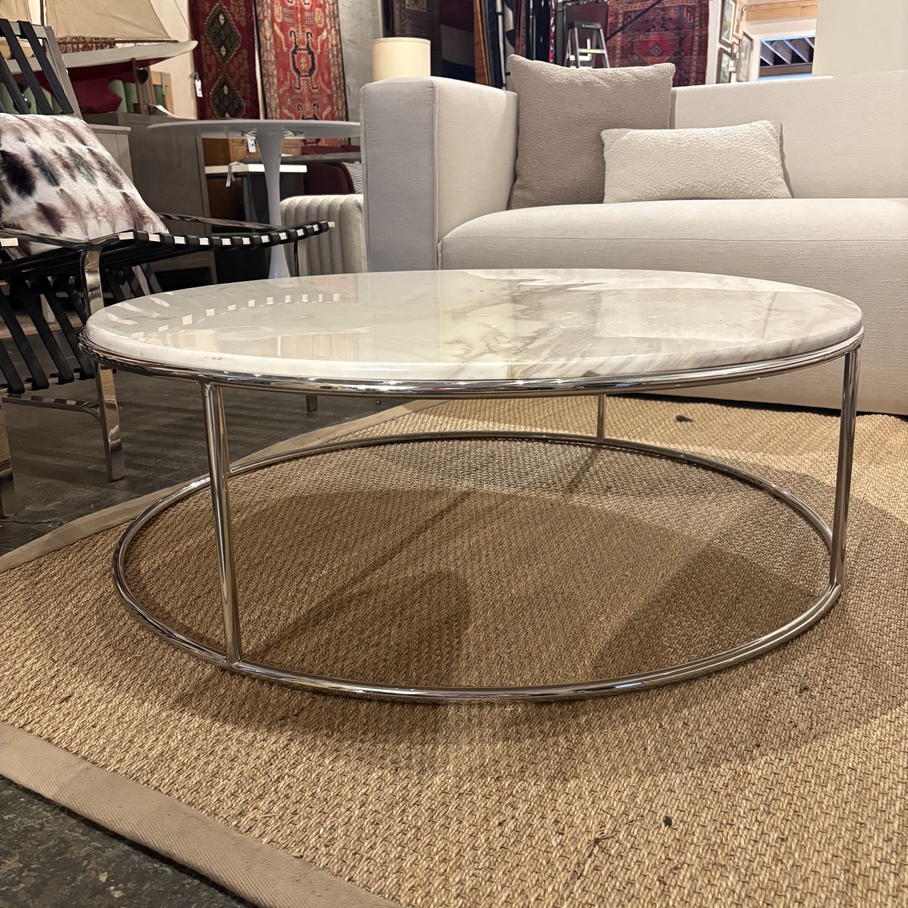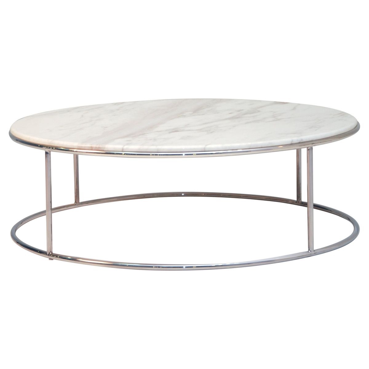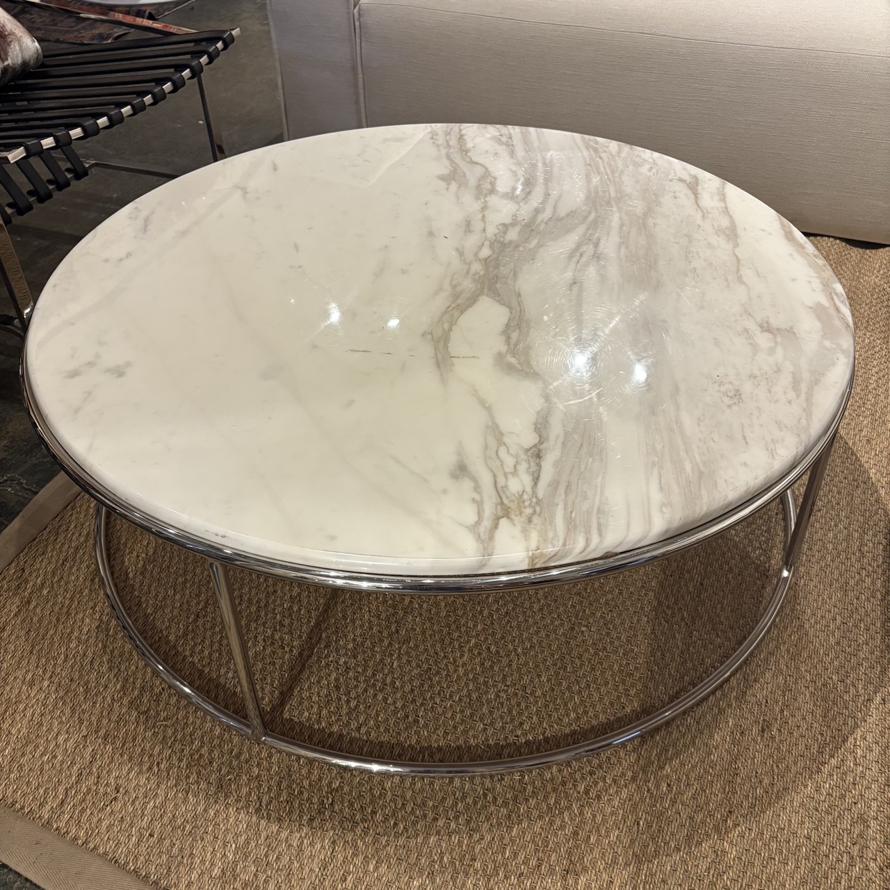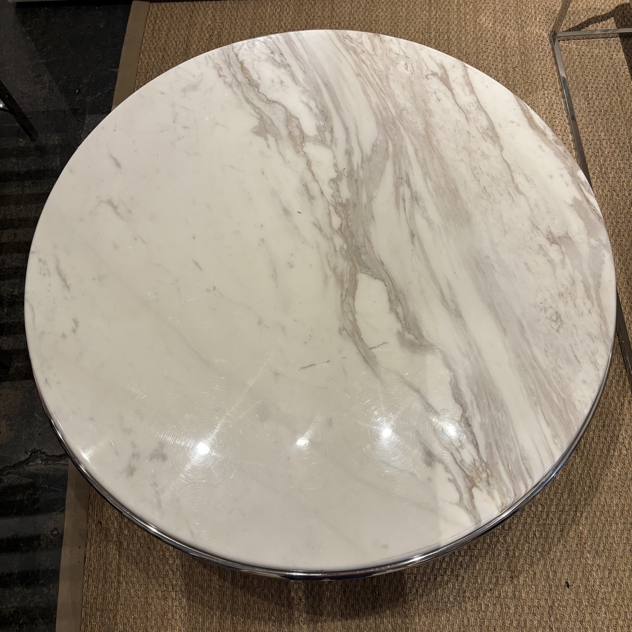 - Clear coated Volakas marble table top, a stone from Greece, featuring warm grey and cream veins