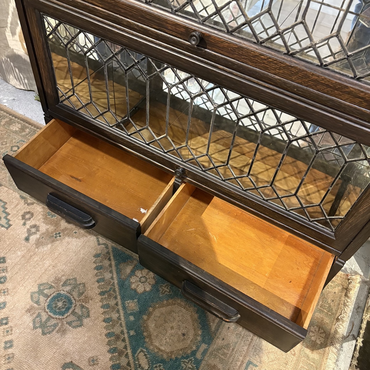 - Wooden bookcase with mirrored interior and leaded glass cabinet doors