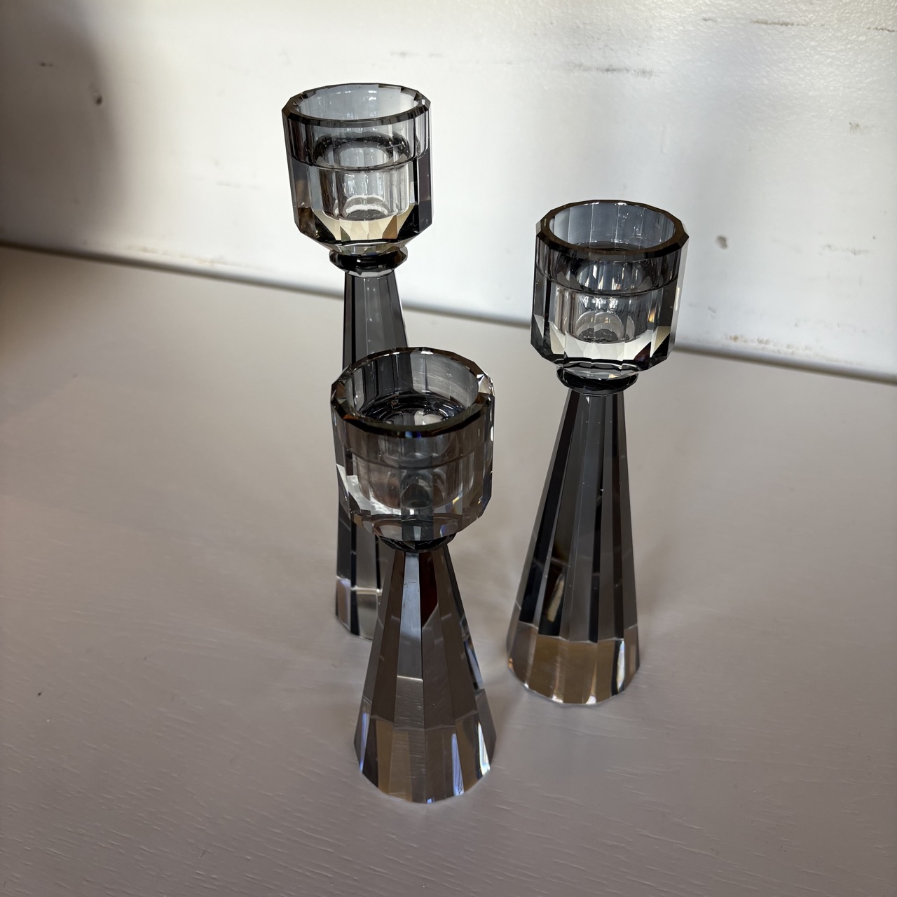 - Gray smoked crystal candlesticks