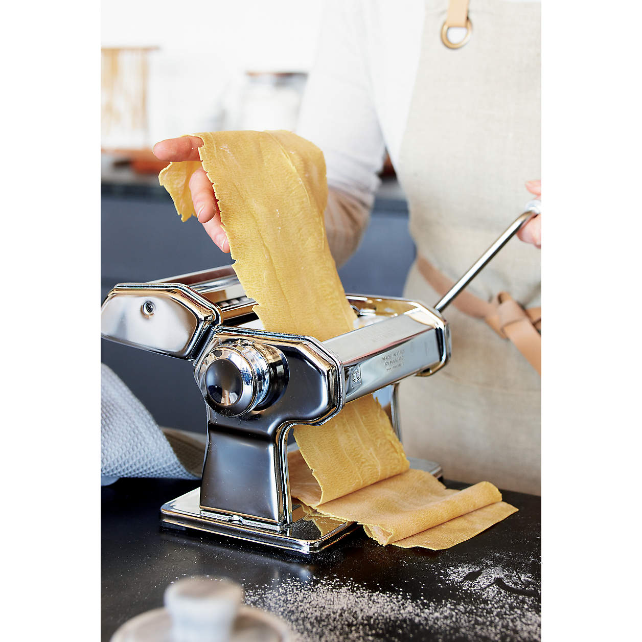 - The most versatile manual pasta maker on this market, this Italian steel hand-crank device with a commercial countertop presence puts out perfect linguine, spaghetti, and lasagne noodles in minutes. Flat rollers create the dough sheet; double-cutter is removable for easy cleaning.