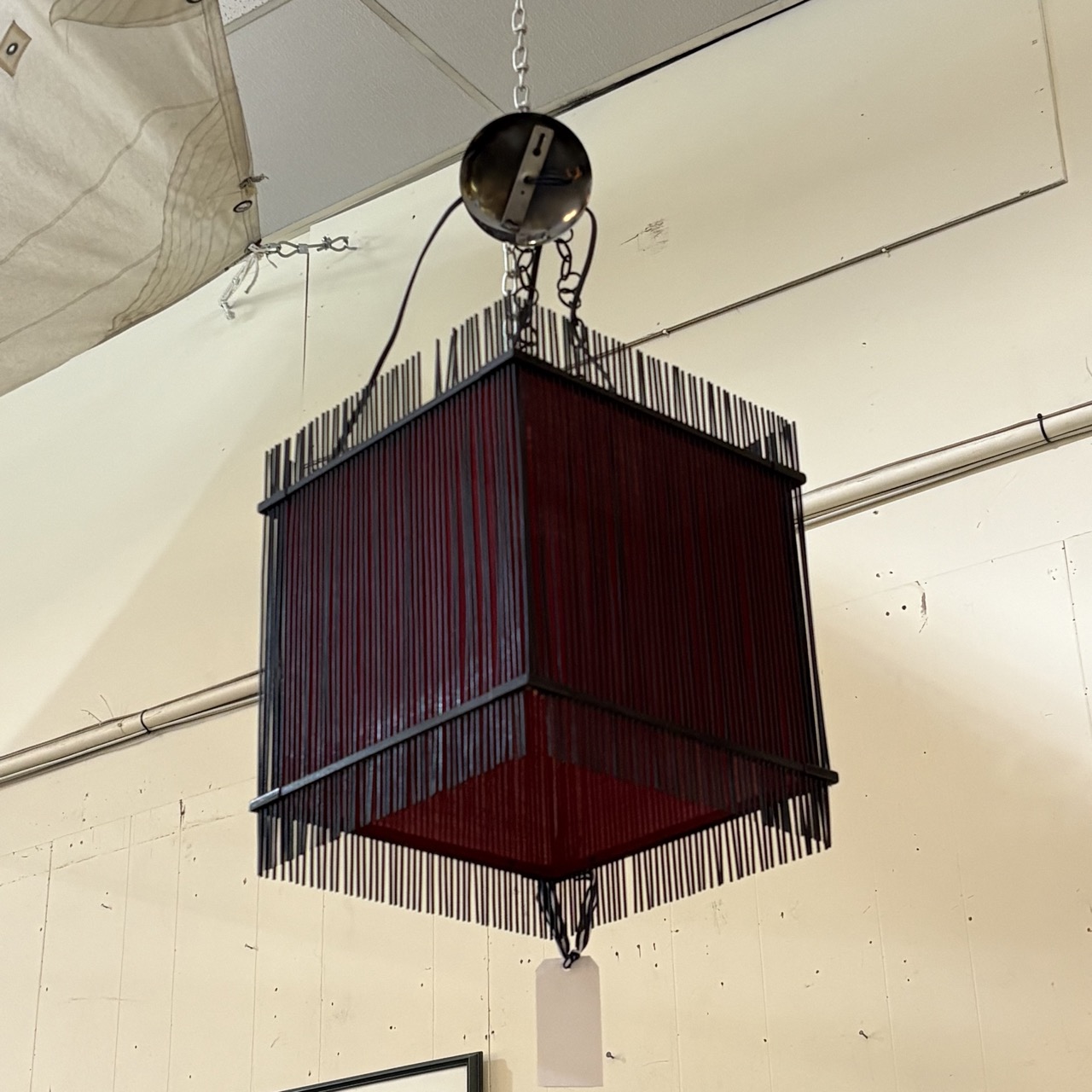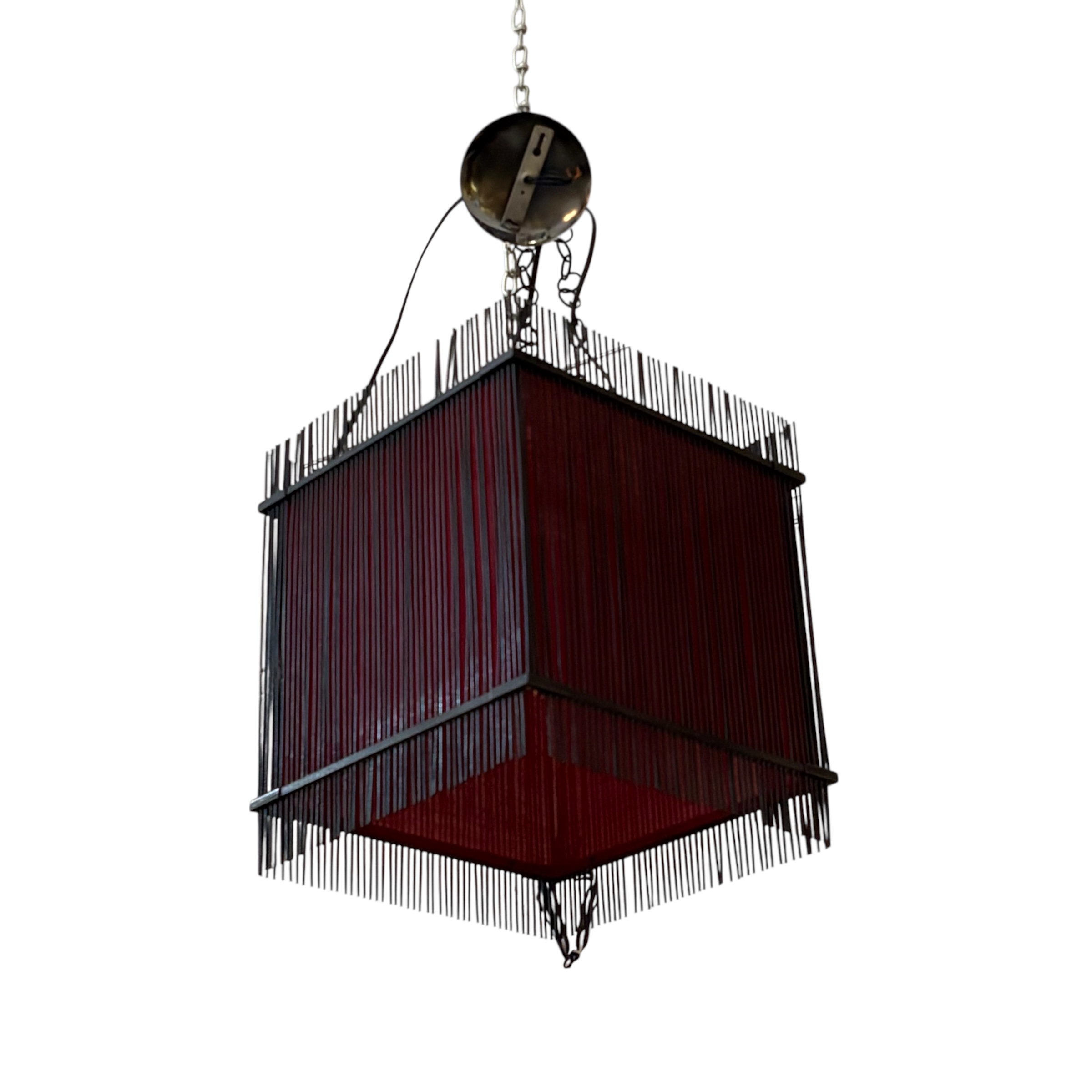 - Red lampshade with black wooden sticks