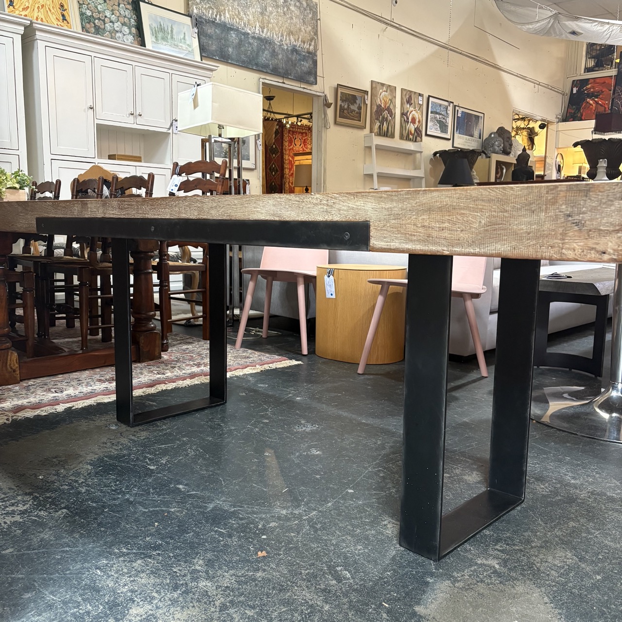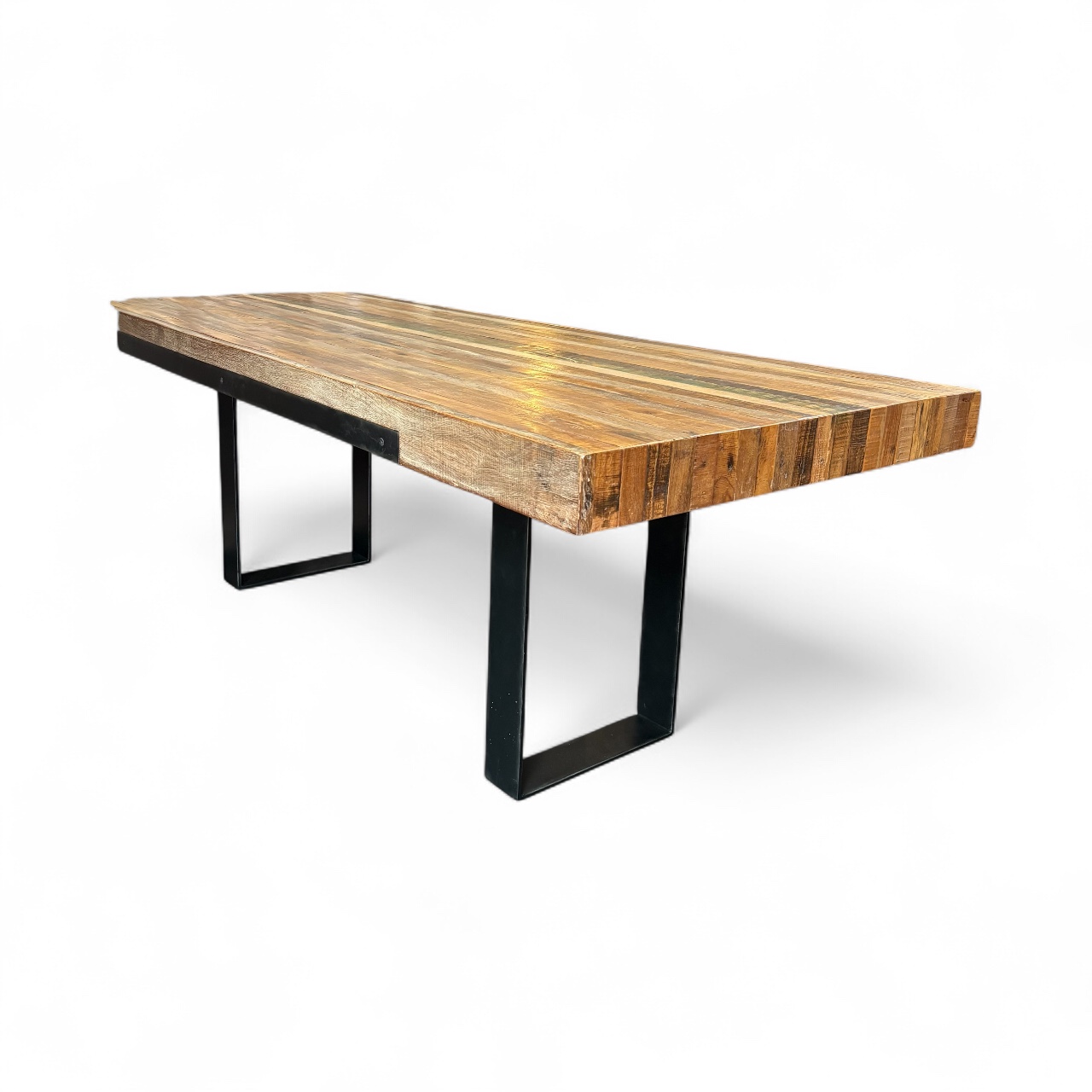 - Wooden table top with black metal legs