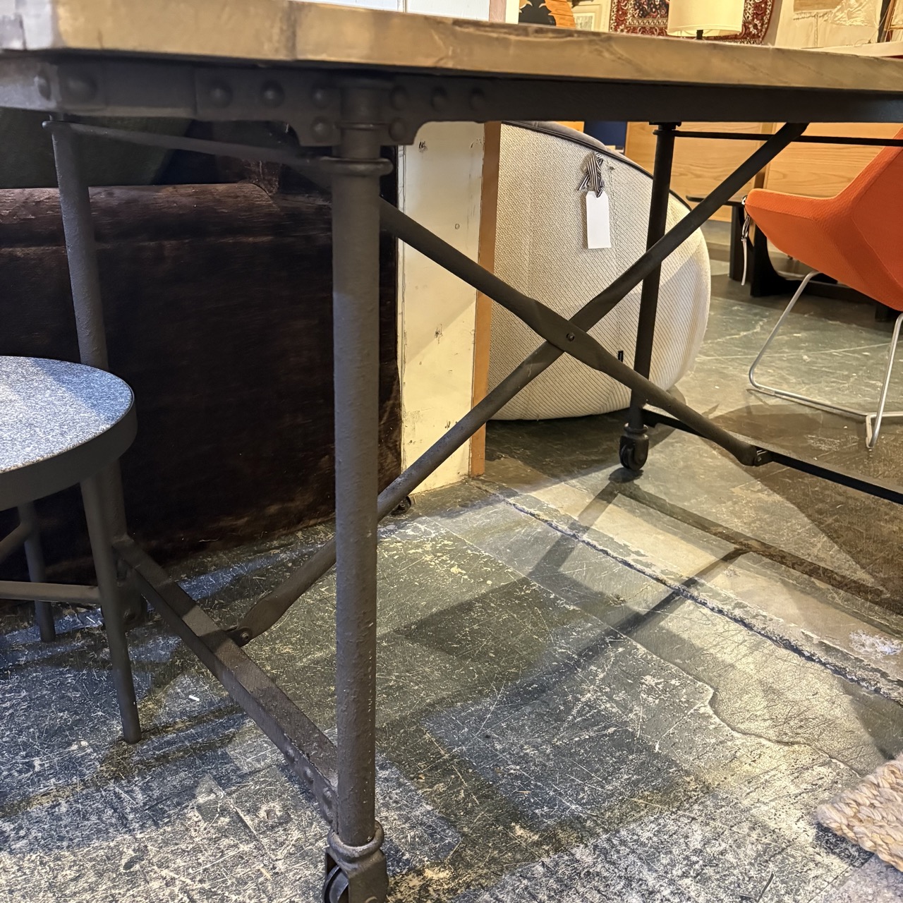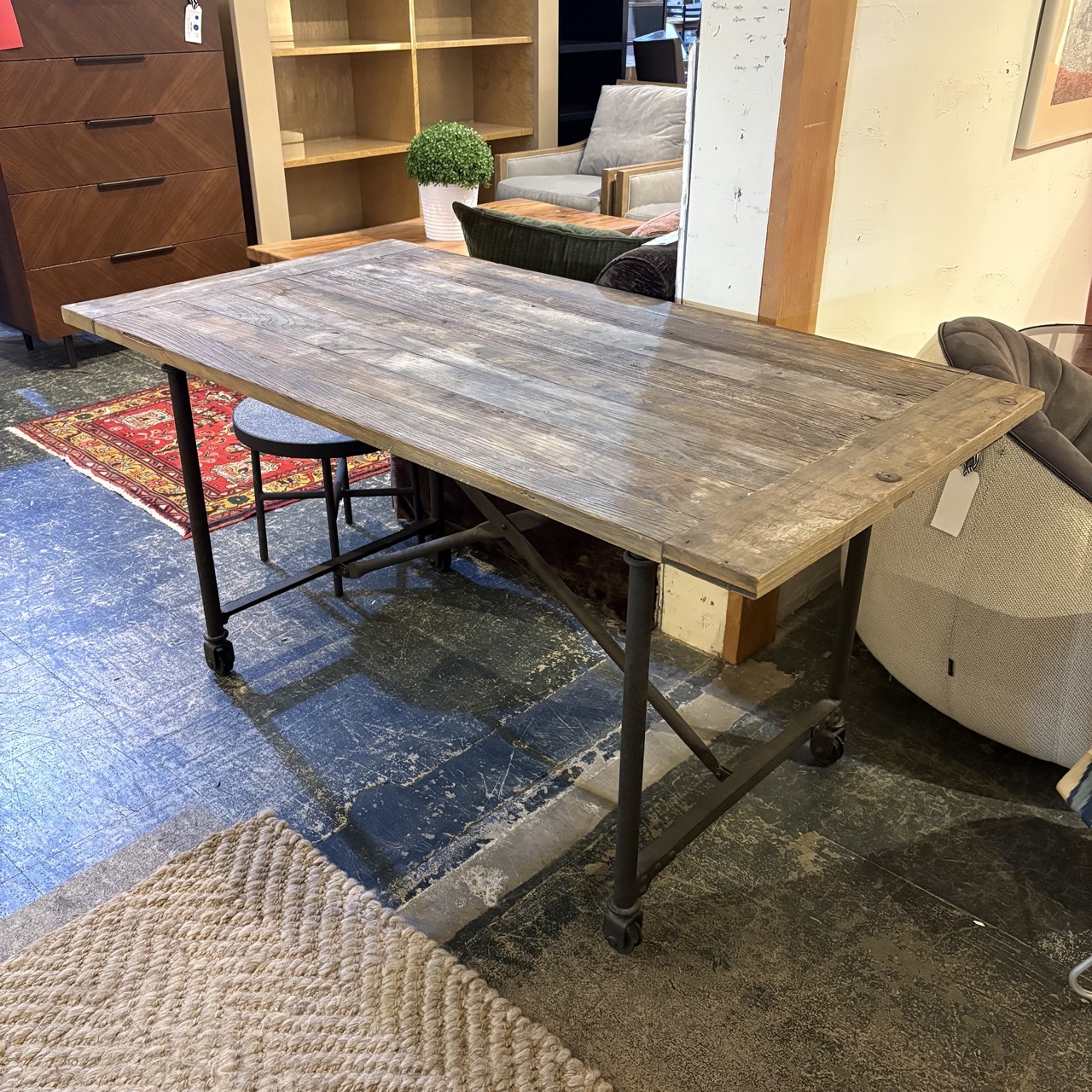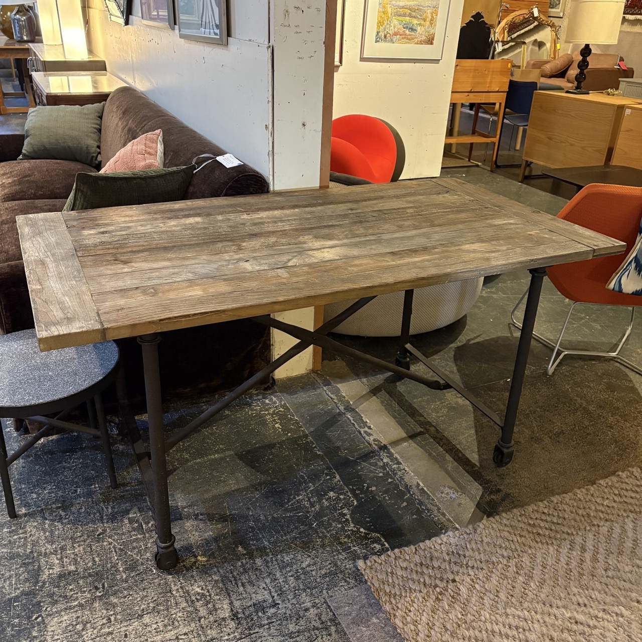- Reclaimed wood top with metal legs and casters