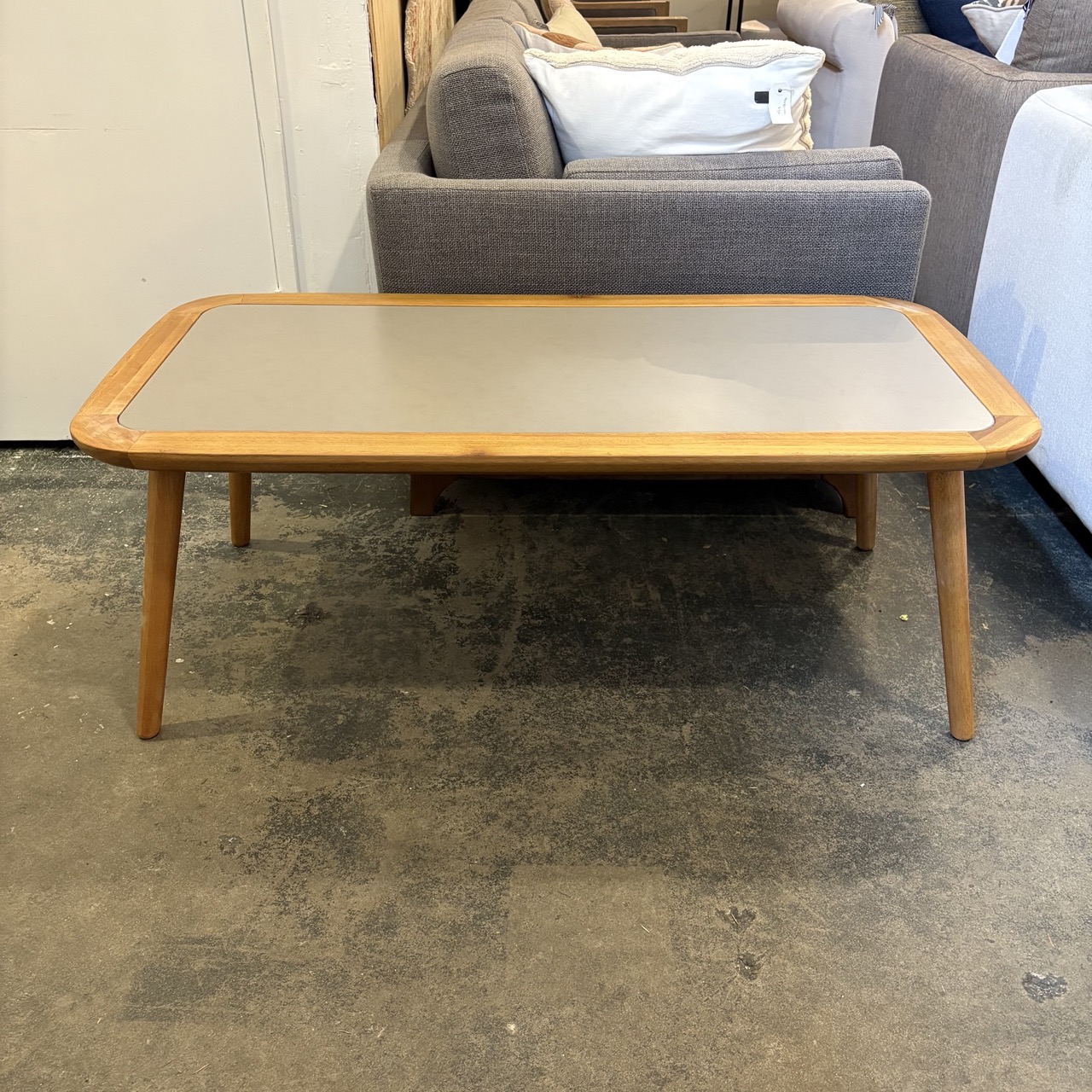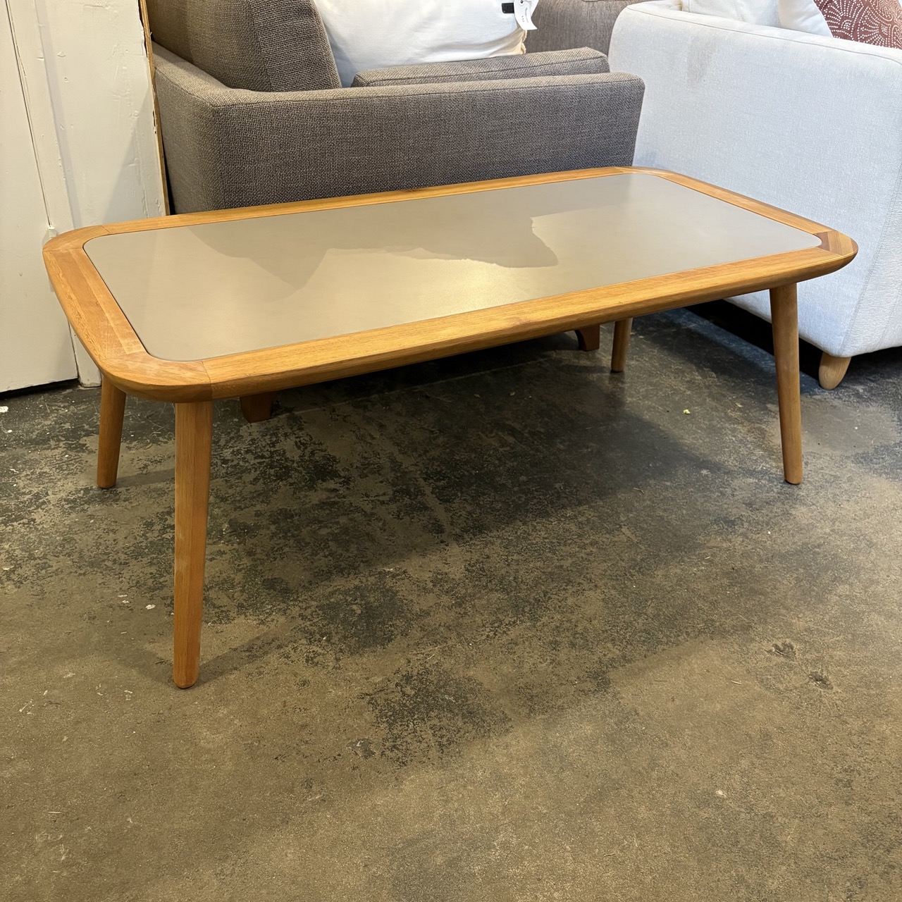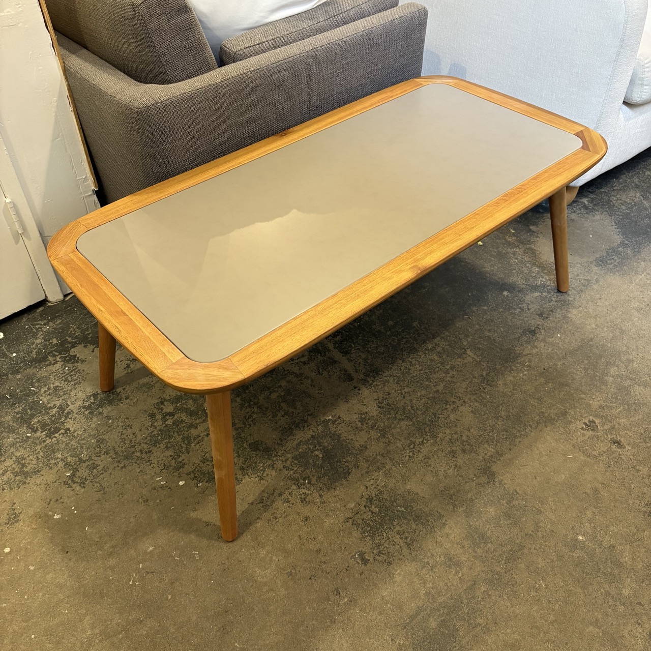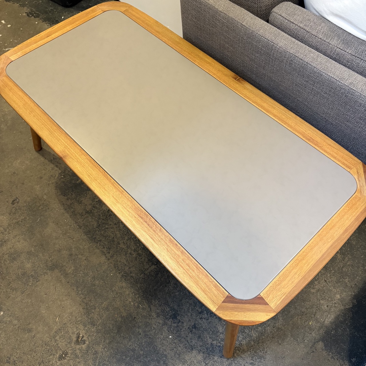 - Wood table with gray metal insert