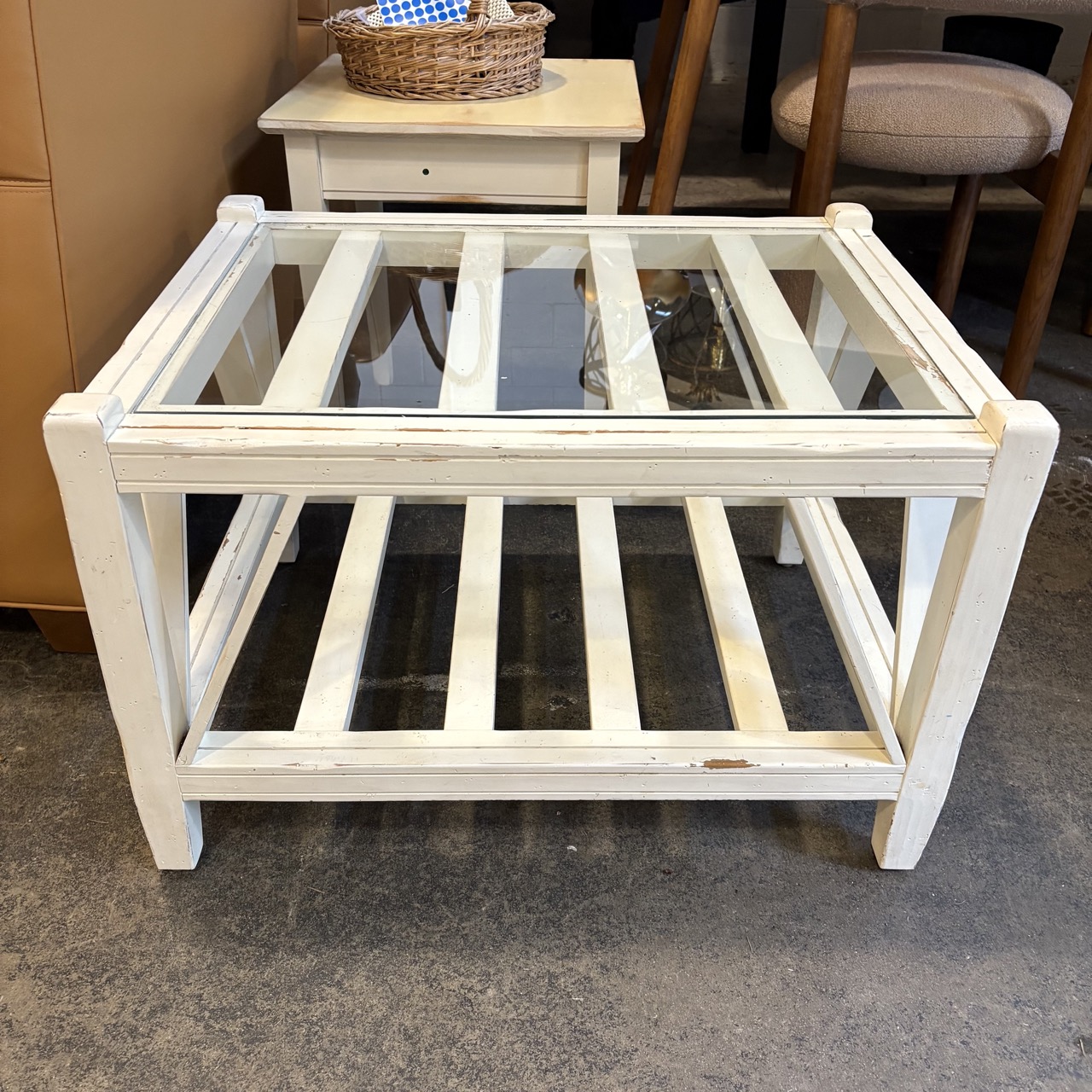 - Distressed white paint on wooden frame with glass top