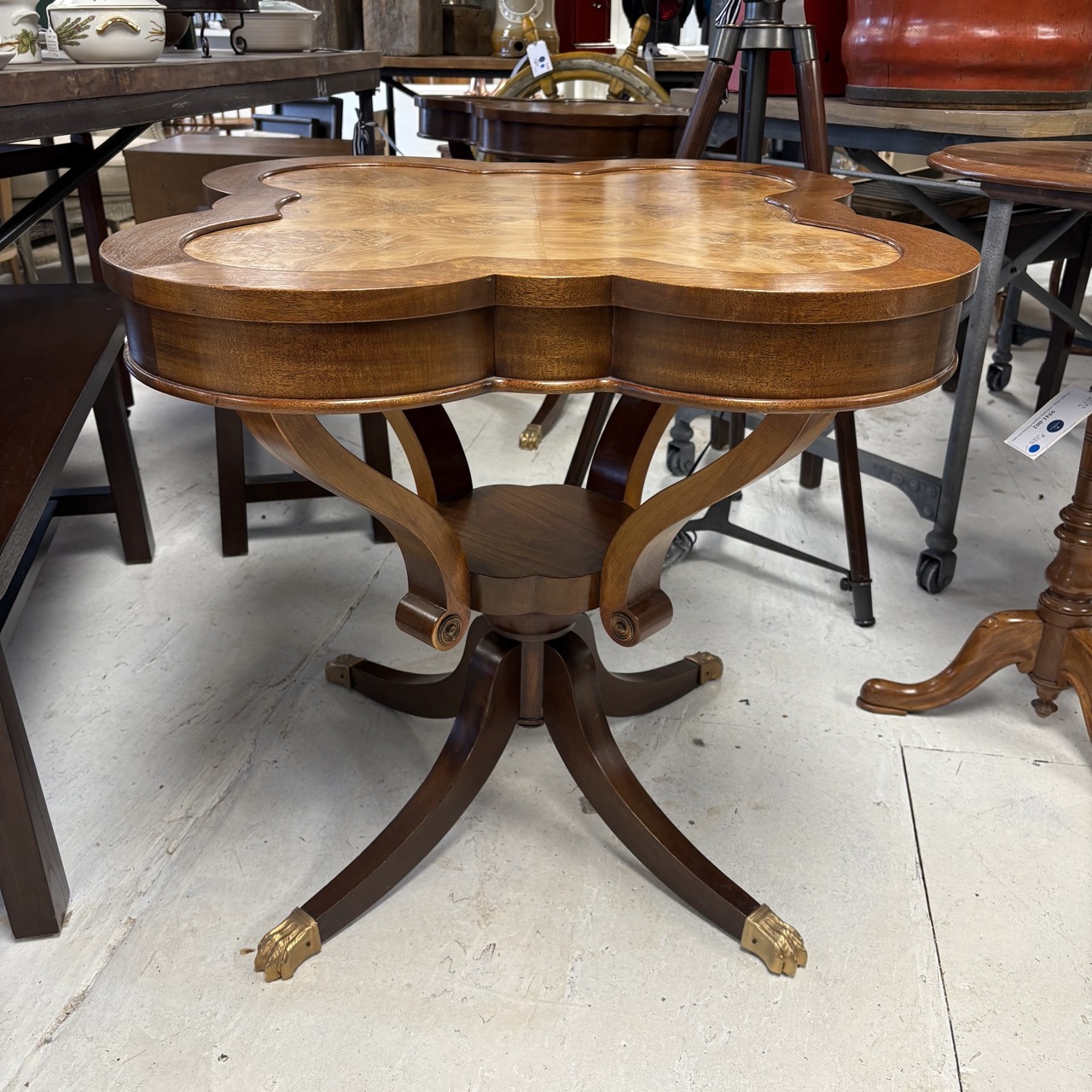 - Mahogany with burled elm in centre on pedestal base with brass lion feet