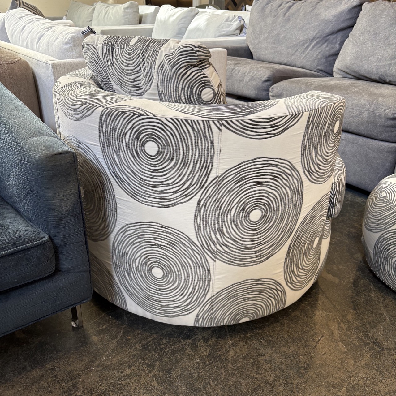- Swivel chair featuring a half-circle back and loose back cushion