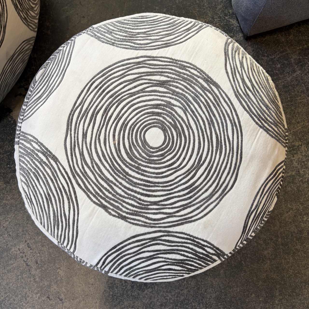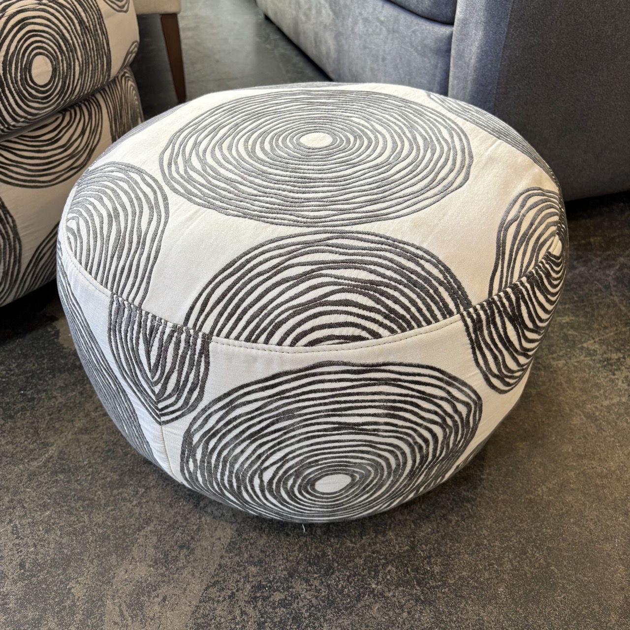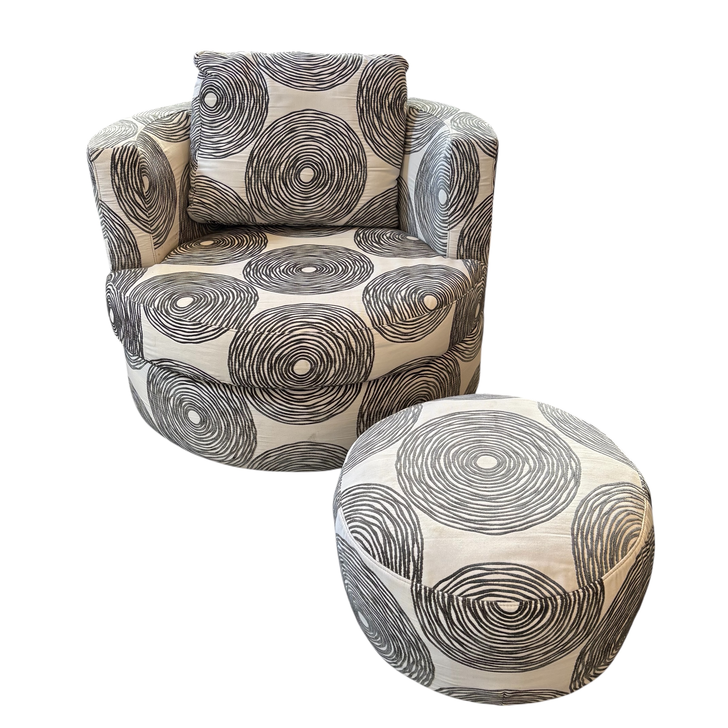 - Chair and ottoman upholstered in custom white fabric with chenille geometric pattern