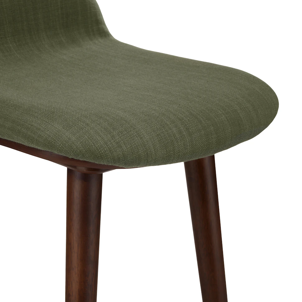 - Foam padded seat and back in Olio Green fabric upholstery