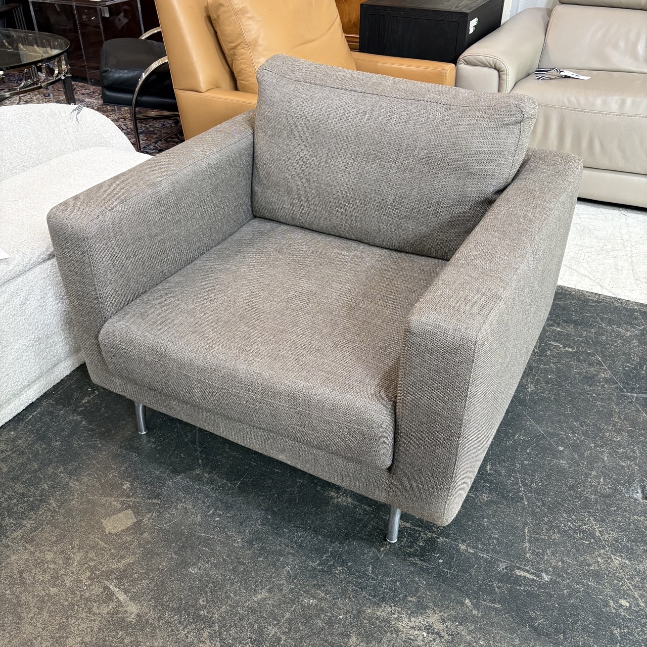 - Gray fabric upholstery with stainless steel legs