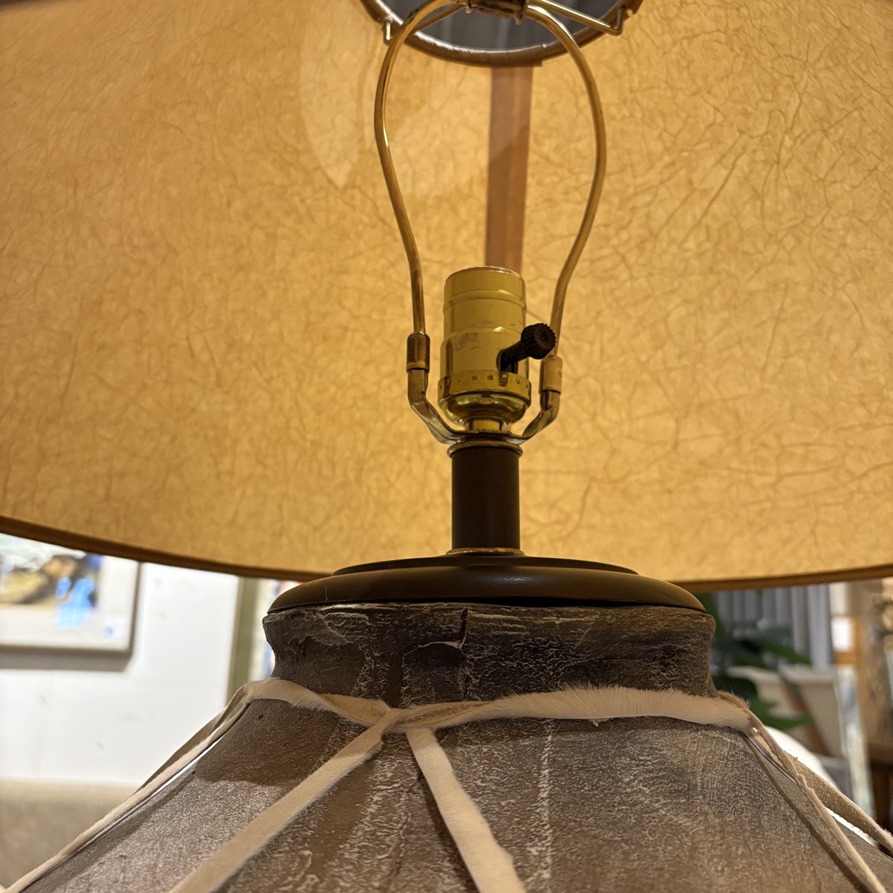 - Table lamp crafted from Tarahumara pottery featuring a distinctive woven wicker decoration