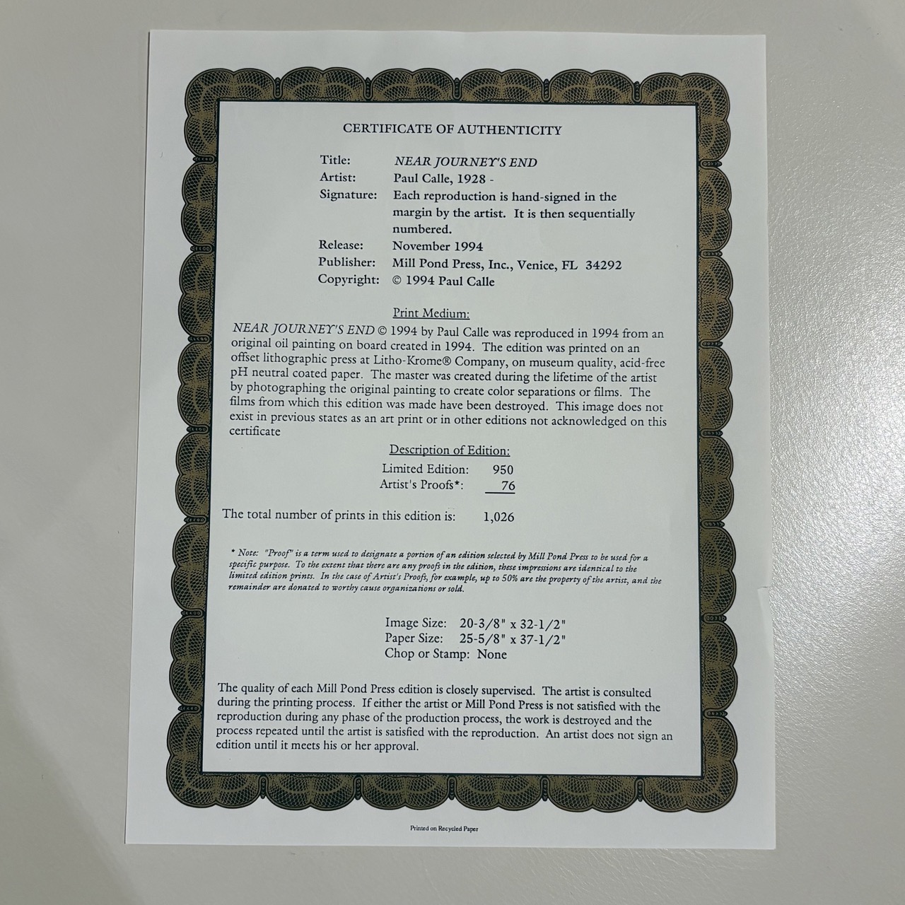 - Special edition print released in 1994 from an original oil painting on board created in 1994. Printed on offset lithographic press an museum quality, acid-free pH neutral coated paper